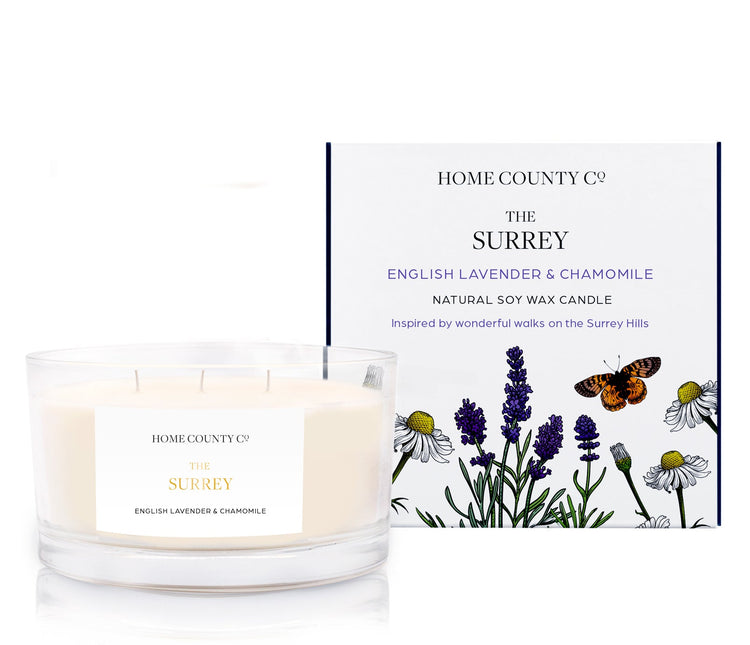 Picture weekend walks amongst the wild landscape of the Surrey Hills - pockets of fragrant lavender and calming chamomile popping up amid the shrubbery with this calming lavender 3 wick candle.