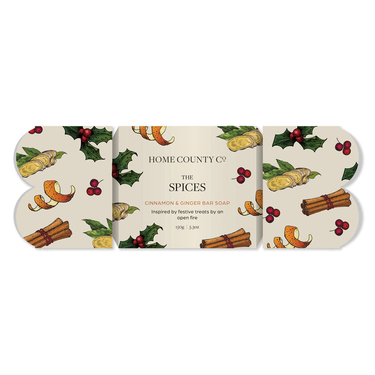 A pack of 12 luxury Christmas cracker soap bars, scented with Cinnamon and Ginger, inspired by festive treats by an open fire.